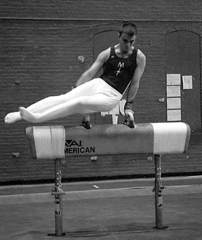 Luke Massery ’02 executes his horse routine in a gymnastics meet against Southern Connecticut Saturday.