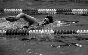 Kristen L Clements ’02 won the freestyle event during last Wednesday’s meet against Salem State College.