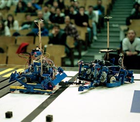 Two Lego robots clashed during the qualifying round of the “Bots in Blue” 6.270 contest. The final round will be held Tomorrow at 6 p.m. in room 26-100.