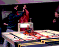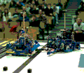 In one match, a robot scored several points while pushing blocks into the other team’s goal. However, the opposing robot did not function. Thus, the non-functioning robot won the round without qualifying, but the losing robot qualified. Such odd matchups were not uncommon in Round One. In several matches, the placebo robot, employed during single robot matches, was victorious in much the same way. The relatively small crowed cheered the placebo robot more than any team’s creation.