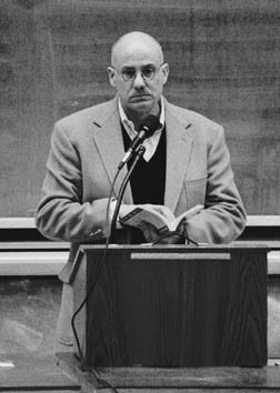 Ellroy's reading was well-attended, but at nowhere near the full capacity of 26-100. No matter; immediately after being introduced by Associate Dean Perelman, Ellroy strode to the blackboard. He picked up a piece of dark pink chalk and proceeded to write in proud letters, "Ellroy Rules! Chomsky Drools!" The audience cheered wildly. That set the tone for the rest of the evening.