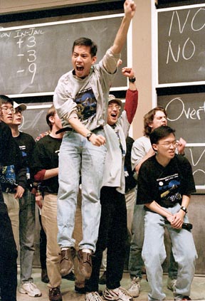 LouiE, LouiE! - The creators of this year’s winning 6.270 robot, King Louie, celebrate their victory.
