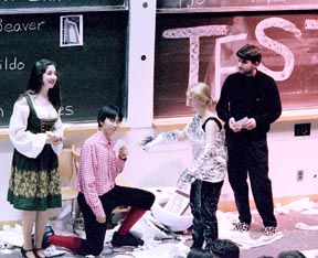 Maggie A. Sullivan ’03 and Brian M. Wong ’03, as Handsfull and Gretel, are told by “Fuck” Vest Josh C. Randall ’01 to stop licking the Stata Center- played by Mira E. Wilczek ’03.