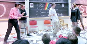 Wong and Joe A. Cirello ’01 of team “Cock” use something “new, something different, something... gay!” -- a Delta Lambda Phi pokÉmon (Corey M. Gerritsen ’02) against Sharp’s “bouncing boob defense” Sigma Kappa pokÉmon.