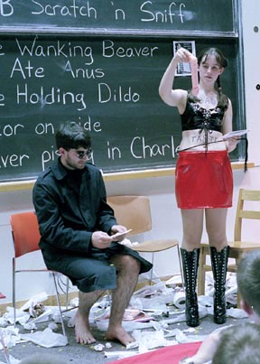 Anna K. Benefiel ’00 studies a phallic squirt gun as Randall explains the illusion of the MITrix, the theme of this year’s Bad Taste t-shirts.