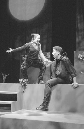 Oberon (Jeff Lee, right) realizes that Puck (Abby Spinak ’01), an impish fairy, has mistakenly charmed the wrong lovers, leading to a comedy of errors.