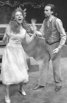 Helena (Jean Barnwell ’03) breaks down as Lysander (Brian Keller ’01) relentlessly pursues her hand.