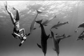 Dr. Kathleen Dudzinski, a marine scientist, swims in the wild as she studies dolphin behavior and vocalizations with the use of a mobile video/acoustic array.
