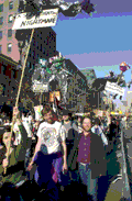 The protest, the culmination of a weekend counter-conference called Biodevastation 2000, sought to raise awareness of the dangers of genetic engineering, corporate control, and the lack of government regulation and oversight.