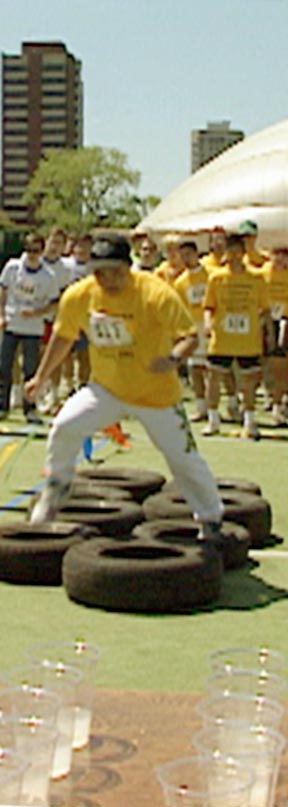 A student struggles through tires in an obstacle course at the last Johnson Games, held in 1991.