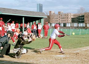 Team captain Alexandra Pearlman gets a hit in Friday’s game against Wentworth Institute of Technology. MIT held the score at 3-3 until the seventh inning, then fell behind for a 3-6 loss.