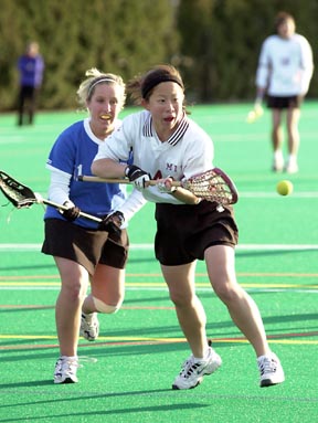 Theresa Cheng ‘02 shovels the ball to a teammate Wednesday in women’s lacrosse action against Colby-Sawyer College. MIT dominated the contest, finishing ahead 16-10.