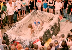Mud on your face -- Antonio Vicente '02 wrestles Jennifer Selby '03 (in brown) and Malima Wolf '03 (in blue) as fans cheer and gawk during this year’s Steer Roast.