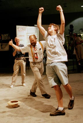 Lang Bests Neo for 2.007 Title With Asteroid Shove at Buzzer"Tell us how you feel!" "Tired." "Favorite equation?" "F=ma!" That was the response Kevin R. Lang '02 gave to host Professor Alex H. Slocum seconds after winning the final round of the 2.007 contest, known this year as "Sojourner This!" Professor of Physics Walter H. G. Lewin would be proud. | ||