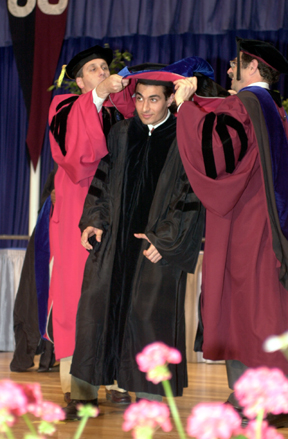 Sohrab Ismail-Beigi G stoops to receive his doctoral hood in Physics from Chancellor Bacow and Physics Department Head Marc. A. Kastner yesterday in Johnson Athletic Center.