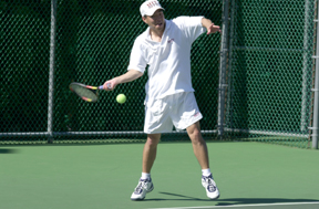 Three-time All-American Eric Chen ’00 leads the tennis team to a victory at home in the NCAA regional tournament, held May 14-15 on the west tennis courts.