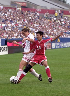Gold Cup Soccer(right) US soccer star Mia Hamm fights Brazil’s Juliana Cabral for control of the ball. | |