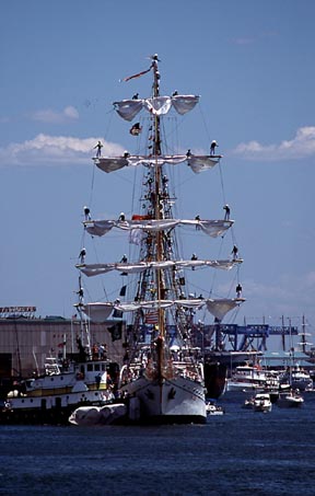 Sailors on the Indonesian ship Dewaruci prepare its rigging for Tuesday’s Parade of Sail, the keynote event of Sail Boston 2000.