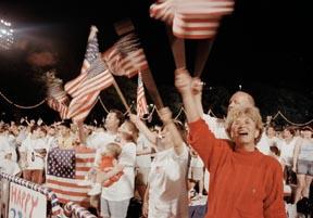 Proud Bostonians wave American flags at Boston’s Independence Day celebration.