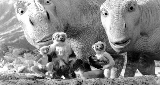 Iguanodons Aladar (left) and Neera, and their lemur companions (from left) Suri, Yar, and Plio in Disney’s Dinosaur.