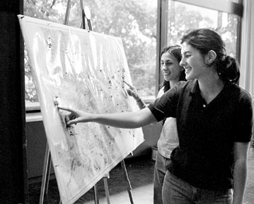 Lis B. Evans ’04 (front) and Allison Gallo ’04 mark their hometowns with pushpins on the Orientation hometown map.
