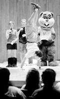 The opening continued with a series of games involving members of the freshman class. In the first game, contestants went on a scavenger hunt, searching for a neon-clad Orientation leader, an authentic brass rat, and a copy of “Our Bodies, Ourselves,” a booklet which MIT provided free to incoming females.