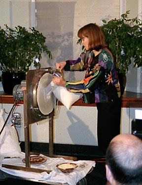 Amy Smith G demonstrates her invention, a grain grinder designed for use in developing countries. Smith’s invention won this year’s Lemelson-MIT student prize for inventiveness.