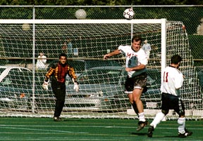 Guillermo Abadia ’83 clears the ball from the alumni goalmouth during the Alumni soccer game on Saturday. The MIT student team beat their older counterparts 9-3 in an entertaining game.