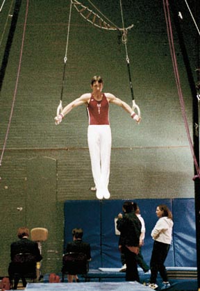 Men’s Gymnastics team co-captain John C. Olsson ’00 lowers into a cross. MIT was narrowly defeated by the University of Vermont on Saturday.