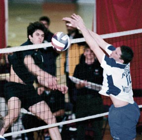 Daniel M. Roy '03 hits past an opponent Saturday in Rockwell Cage. The Englneers lost 1-3 to Roger Williams University.