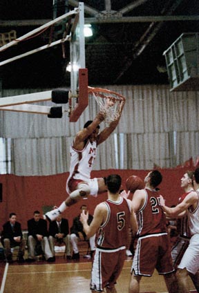 Terraun L. Jones ’01 hangs off the basket after a slam dunk during Saturday’s 58-64 loss to Clark University.