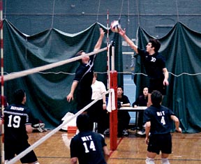 Dan M. Roy ’03 defends against a spike in Tuesday’s match against Harvard University. The school up the street squeaked by the Engineers with a 3-2 win.