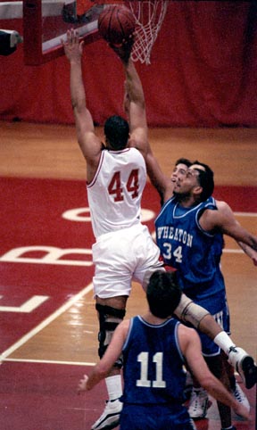 MIT forward Terraun Jones ’01 reaches for the basket during Tuesday’s narrow loss to the Wheaton College Lyons.