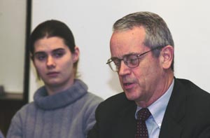 UA Speaker Jaime E. Devereaux ’02 looks on as President Charles M. Vest addresses last night’s UA Council meeting.