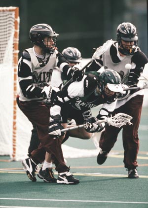 Two Engineers plow a Panther to take possession. MIT defeated Plymouth State in an exhibition match.