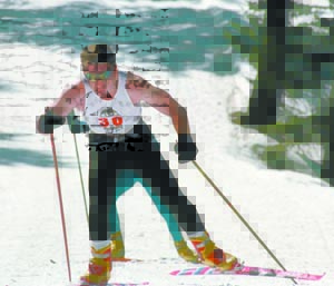 Samuel T. Coradetti ’02 skis in the 15-kilometer skate race at the Nordic Ski Nationals in Bogus Basin, Idaho. Coradetti led the team to a fourth place finish in the men’s overall Nordic Championship.