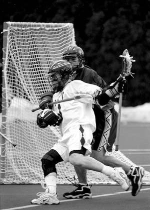 Matthew P. Van Horne ’02 runs past a Massachusetts Maritime Academy player during the men’s lacrosse match on Saturday, March 24. MIT won the match 19-8.
