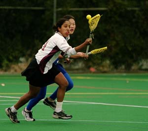 Andrea E. Noronha ’03 grabs the ball from a Wellesley player during the women’s lacrosse game on Saturday. MIT lost to Wellesley College 18-5.