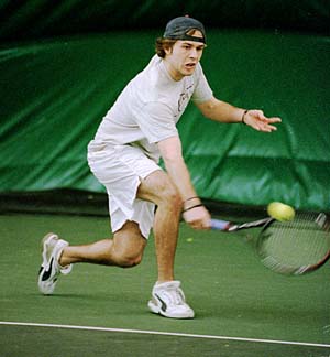 Jeffrey P. Augustyn ’03 backhands a shot during the tennis match against Bowdoin. Augustyn won his match in a third set tiebreaker.