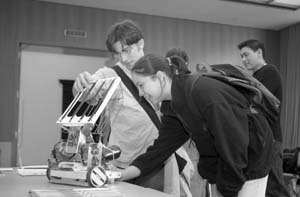 At the Course II open house on Tuesday, Teresa K. Yamana ’04 and Benjamin Lichtenstein ’04 inspect a robot designed for 2.007.