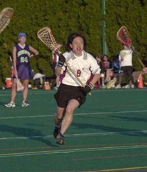 Sarah Briggs ’03 breaks through the Endicott defense during the women’s lacrosse game on Tuesday. MIT won 14-8.