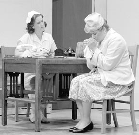 Veta (Sheridan Zabel) sobs aloud while convincing Nurse Kelly (Maureen Graham) that her brother should be committed to a sanatorium because he has an imaginary friend named Harvey.