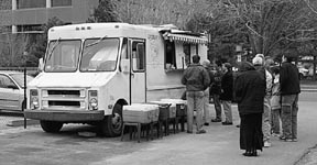 The food trucks located at 77 Massachusetts Avenue and next to Building 68, including the popular Goosebeary’s truck shown here, are popular options for on-campus dining.