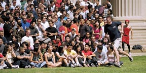 A freshmen runs across the facade in an attempt to appear twice in his class picture.