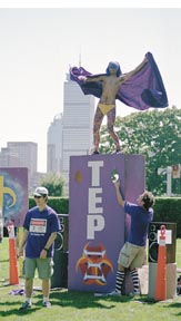 At Killian Kickoff, Tau Epsilon Phi dancer Victor W. Brar ’04 works his hardest to attract like-minded frosh to his fraternity.