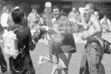Outnumbered and outgunned by (right to left) Rodin O. Entchev ’02 and Riad S. Wahby ’02, members of the east campus army, a soldier from west campus attempts to hold his ground.