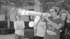 Matthew D. Mishrikey ’02 fires the tennis ball cannon during East Campus rush.