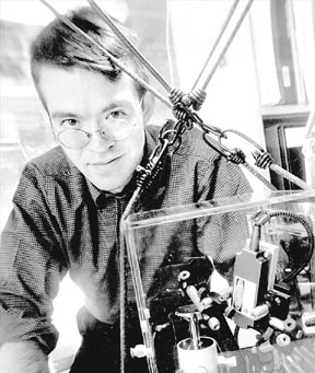 Brain Hubert G displays his nano-assembly machine, which is capable of picking up virtually any type of material, several thousand atoms at a time.
