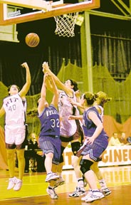 Crystal A. Russell ’03 (40) and Cristina Estrada ’01 (33) go up for an offensive rebound on Tuesday. MIT defeated Wheaton, 72-53.