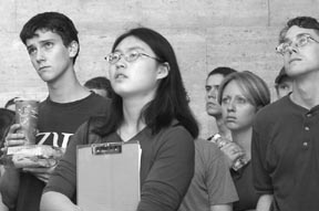 MIT students watch for news of Tuesday morning’s terrorist attacks on the television in Lobby 10.